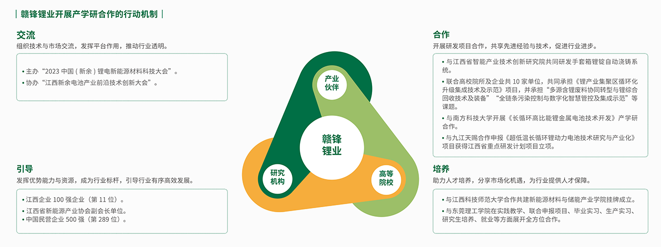 赣锋锂业秉持“开放、合作、共赢”理念,积极参与行业技术合作,充分发挥自身先进技术优势,与产业伙伴、研究机构、高等院校开展技术交流与指导、合作研发、人才培养项目,带动行业全面升级,通过共建科研机构、共同承担国家(省级)重大科技项目、联合开展技术攻关等形式,大幅提升企业科技创新能力,并荣获“江西省对外合作基地与引智示范基地”称号。